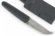 This Aikuchi by Bud Nealy features a Damascus tanto blade with .102" blade stock and 1.027" blade depth, full tang construction. The handle has black rubber scales. Includes a kydex system. Excellent condition. #784