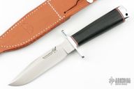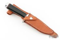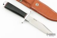 This Model 5 by Blackjack Knives features a satin finished blade with a false top edge, .216" black stock and 1.134" blade depth, hidden tang construction. The handle has an aluminum guard, black linen micarta grip with red/white/black spacers, aluminum butt with lanyard hole. Comes with original box and brown leather sheath. Excellent condition.