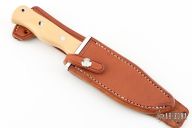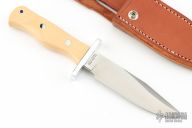 This Model 13 Halo Attack by Blackjack Knives features a satin finished clip point blade with false top edge, .235" blade stock and 1.243" blade depth, full tang construction. The handle has a polished aluminum guard, antique ivory paper micarta grip. Comes with original box and brown leather sheath. Excellent condition.
