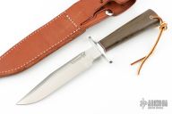 This Model 1-7 by Blackjack Knives features a satin finished blade with false top edge, .219" thick and 1.214" deep, hidden tang construction. The handle has an aluminum guard, green canvas micarta grip with red/white/black spacers, lanyard hole. Comes with original box and brown leather sheath. Excellent Condition.