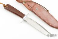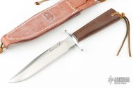 This Model 1-7 by Blackjack Knives features a satin finished blade with false top edge, .219" thick and 1.189" deep, hidden tang construction. The handle has an aluminum guard, brown canvas micarta grip with red/white/black spacers, lanyard hole. Comes with original box and brown leather sheath. Excellent Condition.