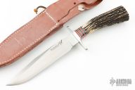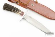 This Model 1-7 by Blackjack Knives features a satin finished blade with false top edge, .219" thick and 1.197" deep, hidden tang construction. The handle has an aluminum guard, stag grip with red/aluminum/black spacers, lanyard hole. Comes with original box and brown leather sheath. Excellent Condition.