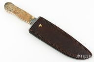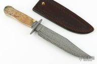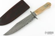This Bowie by Journeyman Smith Craig Camerer features a Damascus blade with a false top edge, .269" blade stock and 1.698" blade depth, hidden/frame tang construction. The handle has a Damascus guard, fluted collar and frame, mammoth ivory scales with nickel silver pins. Comes with a hand tooled brown leather sheath with a belt stud and a zippered case. Excellent condition.