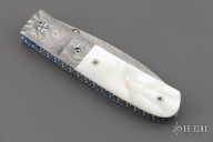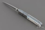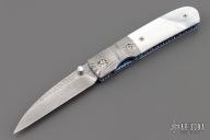 This liner lock by Mel Pardue features a Damascus blade with a single thumb stud with mother of pearl inlay. The handle has dovetailed Damascus bolsters that have been fluted and fileworked, mother of pearl scales, jeweled and fileworked anodized titanium liners, fileworked Damascus backspacer. Nice detent, lockup and blade seating. Has some light spotting on the blade, otherwise excellent condition. Comes with a zippered case.