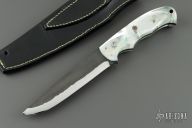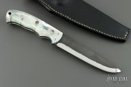 5.4 inch Special Black Finished, Solid D-2 Drop Point Steel Blade with Convex grind. This Full-Tang knife is fitted with a impressive art of Mr. Arakawa's original handmade Custom Aurora Hybrid Resin Handle that has Good Weight and Durability.
