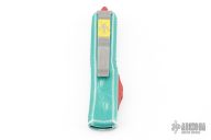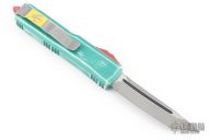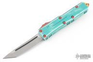 This UTX-85 Bounty Hunter by Microtech features a tanto blade with fullers, satin flats and apocalyptic finished grinds. The handle has a green battle worn aluminum handle with red hardware, tip down apocalyptic finished stainless steel clip. Comes with original box and papers. Excellent condition. S/N 1555 and dated 12/2020.