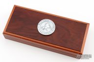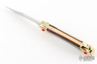 This Buck Model 110 was customized by "Wild Horse", it features a satin finished clip point blade with a single nail nick. The handle has engraved brass bolsters with integral liners and custom "Wild Horse Gold" acrylic scales. Includes maker's card, wooden display box, and original box. Ruby Swarovski inlays. Excellent condition.