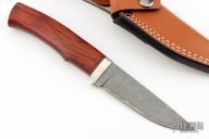 Hattori's sophisticated urban style knife. The blade is 4" Cowry-X powdered steel core with 121 forge layered Nickel/Stainless Damascus blades. 4-1/2" hand contoured Cocobolo Wood handle with Nickel Silver Bolster. Hidden tang construction with no seams. Comes with double stitched custom brown leather sheath.