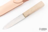 “Magomitsu-saku” is simple and powerful knife, full of vitality as a tool. The materials are; Yasukihagane-Aogami 2 for steel, which can maintain sharpness, and Watetsu of Noto existing for more than 150 years for base metal, which contains less impurities and is resistant to rust. The steel and the iron are combined by a traditional forging way, Wakashi-tsuke. The handle of the knife is made of oak which is hard and resistant to water. It is flat, not curvy, so the longer you use the knife, the more it gets to fit your hand. This all-purpose knife enables you to do many kinds of works such as cutting, sweeping, cleaning fishes and breaking.