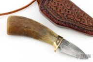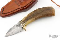 This neck knife by Chuck Schuette features a Damascus (1084 and 15N20) blade with notched thumbrest, .077" blade stock and .900" blade depth, hidden tang construction. The handle has a textured brass guard, big horn sheep grip. Comes with a hand tooled brown leather sheath dated 2024. New from maker.