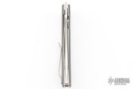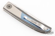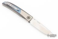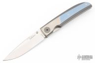 Premium liner-lock designed by US Custom Maker Michael Walker. This model is part of the "Klotzli Collection" of fine knives. The Walker 03-C features a 3-1/2" hollow ground blade of ATS-34 Stainless Steel, blue anodized and milled titanium Handles and a titanium liner. 4-1/2" closed length. SS screws and pocket clip. Comes with original box, papers and leather pouch. Nice lockup, detent, and seating. Excellent condition.