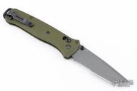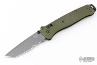 This knife features a bead blasted tanto style blade with partial serrations and dual thumbstuds. The handle has a green aluminum frame with a black backspacer and tip-up pocket clip. Includes the original box and papers. Has ben resharpened. Has a few scratches otherwise the knife is in good condition.