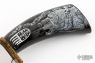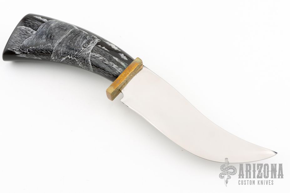 This knife by Ted Miller features a mirror polished upswept blade, .127" blade stock and 1.747" blade depth, hidden tang construction. The handle has a hammered brass guard and a buffalo horn grip with the scrimshaw, turquoise inlay in the butt. It comes with a stand and stone display stand. "TM BC 9"on blade. Excellent condition.