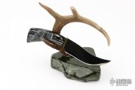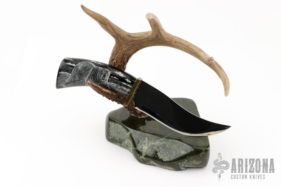 Cherokee Knife Maker, Ted Miller is an American Indian Artisan, of Miami-Peoria-Cherokee heritage. He has won over fifty significant awards. He carves images of his heritage and culture from stories passed down through his ancestors. Ted makes the handles for his knives from natural shed Deer and Elk Antler enhanced with semiprecious stones such as turquoise, coral, and onyx. Black handles are made from Buffalo horn. The blades for the knives are hand-shaped, sharpened, polished and heat-treated individually from 440C stainless steel, 56-60 Rockwell, and acid etched designs are worked on the larger blades . Stands shown are included in the price. All knives are shaped and balanced to provide a perfect grip for the sportsman as well as the ultimate in arts acquisition for the collector. Some handles may be similar in nature or design but each is an original piece with no two being exactly alike. Each knife is individually numbered and comes with a certificate of authenticity