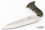 This Slicer by Lowell Bray features a satin finished blade, .107" blade stock and 2.135" blade depth, full tang construction. The handle has green canvas micarta scales with mosaic and stainless steel pins. New from maker. The handle configuration is based on that of a handsaw, hand plane, or hand gun, this knife is intended for use in hard or repetitive slicing without unnecessary strain on the wrist.