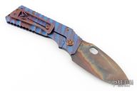 This knife has a S45VN vulcan finish blade with notched thumbrest. The custom finish on the blade features the Medford Knife and Tool logo etched on one side. The handle has a carved Dark blue with rootbeer "Lightning" anodized titanium frame and titanium tip up clip. Nice detent, lockup and blade seating. Includes original box, case and papers dated Jan 22, 2024. Excellent condition.