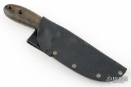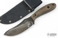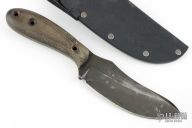 This knife by Barry Dawson features a blued finished upswept blade with notched thumbrest, .223" blade stock and 1.626" Blade depth, full tang construction with micarta handle. Comes with a Kydex belt sheath. Has scuffs and scratches throughout, fair condition.