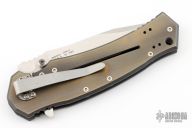 This M1 by Combative Edge features a satin finished partially serrated blade with dual thumbstuds, notched thumbrest and flipper. The handle is anodized titanium with a tip up or down reverse stainless steel clip. Nice detent, lockup and blade seating. Has some spots on the clip, excellent condition otherwise.