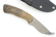 This knife by Barry Dawson features a bead blast finished recurve blade with notched thumbrest, .138" blade stock and .912" Blade depth, full tang construction with micarta handle. Comes with a Kydex belt sheath. Has scuffs and scratches throughout, fair condition.