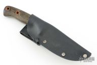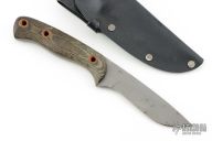 This knife by Barry Dawson features a bead blast finished recurve blade with notched thumbrest, .127" blade stock and .905" Blade depth, full tang construction with micarta handle. Comes with a Kydex belt sheath. Has scuffs and scratches throughout, fair condition.