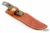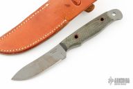 This knife by Barry Dawson features a bead blast finished blade with notched thumbrest, .164" blade stock and .893" Blade depth, full tang construction with micarta handle. Comes with a leather belt sheath. Has scuffs and scratches throughout, fair condition/good user condition.