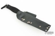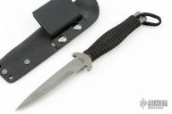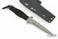 This knife by Barry Dawson features a bead blast finished drop point blade with notched thumbrest, .203" blade stock and .768" Blade depth, full tang construction with cord wrapped handle. Comes with a kydex belt sheath. Has scuffs and scratches, great condition otherwise.