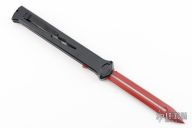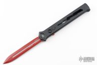 Joining the Estiletto OTF lineup is this fantastic model with a USA cutout on the black anodized aluminum body with black hardware/clip and a red coated dagger blade with plain cutting edges.