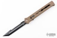 Joining the Estiletto OTF lineup is this fantastic model with a USA cutout on the tan anodized aluminum body with black hardware/clip and a black coated tanto partially serrated blade.