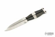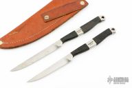 This Spike by Barry Dawson features a satin finished 4400 blade with .249" blade stock and .509" Blade depth. The handle has black epoxy soaked cord wrapped handle. Comes with a leather sheath that holds both knives, not original. Has scuffs and scratches and some rusting, good condition otherwise. One has a blunted tip the other has some slight chipping at the tip. The smaller one, has 3.25" blade length.