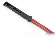 Joining the Estiletto OTF lineup is this fantastic model with a USA cutout on the black anodized aluminum body with black hardware/clip and a red coated tanto fully serrated blade.