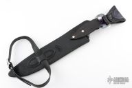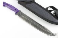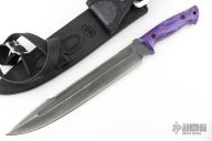 This PPE Cutlass Bowie by Koenscraft features a blued saber ground 8670 steel blade with sharpened top edge and fullers, .224" blade stock and 1.925" blade depth, full tang construction. The handle has purple Juma scales. Comes with a black leather sheath with purple ostrich leg skin inlay by Nixon Leather. Has a couple light scratches, otherwise excellent condition. Comes with COA.