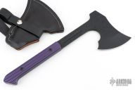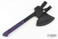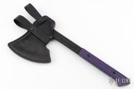 This full tang axe by Jeff Isgro features a hammer marked and black cerakote finished blade with fullers in the tang, .306" blade stock 4.625" blade edge, 5.75" from edge to hammer. The handle has fluted purple G-10 scales. Comes with a black leather sheath. Excellent condition.