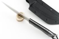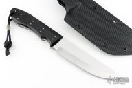 This knife by David Lancaster Clark features a satin finished blade with .163" blade stock and 1.516" blade depth, full tang construction. The handle has black G-10 scales with gray G-10 pins and a fileworked tang. Comes with a kydex sheath with belt loop. New from maker.