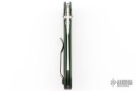 This Benchmade Osborne 940 features a tumble finished clip point blade with swedge and dual thumb studs. The handle is comprised of a machined and green anodized aluminum frame over jimped and purple anodized titanium backspacer. The black coated, steel tip up clip is reversible for right or left hand carry. Comes with original box, and drawstring pouch. Has some light scuffs and scratches, great condition otherwise.