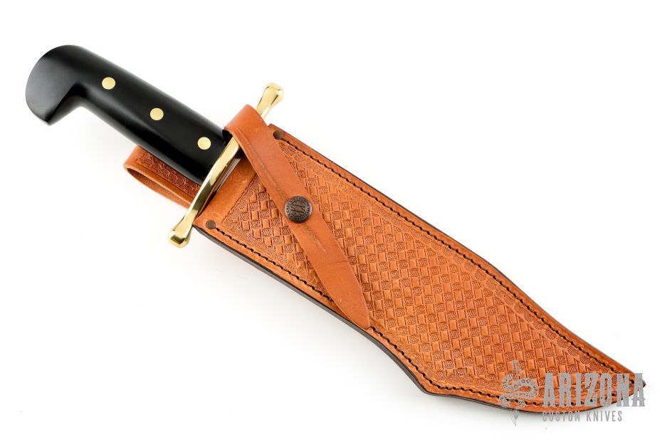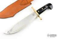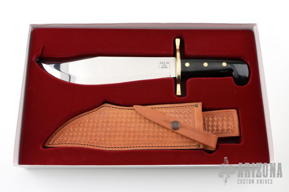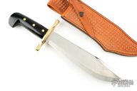 This vintage Bowie from Case Knives features an mirror polished clip point blade with false top edge, .171" blade stock and 2" blade depth, hidden tang construction. The handle is comprised of brass double guard with a black composite grip. Includes a brown leather sheath and original box and papers. Excellent Condition.
