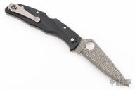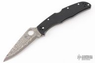 This Endura lock back folding knife by Spyderco features a VG10 core San Mai Damascus blade, thumbhole and notched thumbrest. The handle has pakkawood scales with stainless steel backspacer and 4-way reversible stainless steel clip (not attached, but included). Comes with original box and papers. Also includes spyderco zipper case, and attached lynch deep carry clip. Has a couple light scuffs, excellent condition otherwise.
