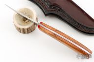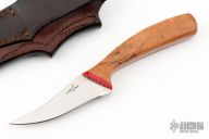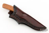 This bird and trout by "Williams" (please let us know if you know who this maker is) features a polished blade with .119" blade stock and 1.026" blade depth, full tang construction. The handle has wood scales with red liners and red bone bolsters. Comes with a hand tooled brown leather sheath by Treestump leather. Excellent condition.