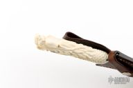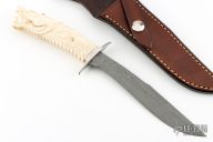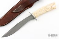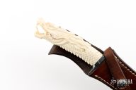 This Fighter by Jim Siska features a stainless Damascus blade with sharpened top edge, .127" blade stock and .919" blade depth, hidden tang construction. The handle has a stainless guard and a carved stag handle. Carving is of a dragon and was done by House Moore. Comes with brown leather sheath. Excellent condition.