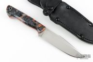This Hellkat Utility by Dan Tope features a satin finished blade with false top edge and notched thumbrest, .152" blade stock and 1.207" blade depth, full tang construction. The handle has "Chaos" resin scales with black canvas micarta pins and orange G-10 liners, lanyard hole at the butt. Comes with original box and black leather sheath. Has some light scratches, the makers mark is mostly rubbed off, otherwise good condition.