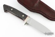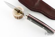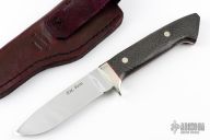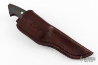 This drop point hunter by Phillip M Parris features a mirror polished blade with .158" blade stock and 1.076" blade depth, full tapered tang construction. The handle has a nickel silver guard, lightning strike carbon fiber scales with red liners and nickel silver pins. Comes with a maroon leather sheath. New from maker.