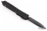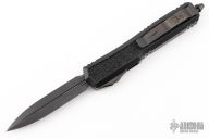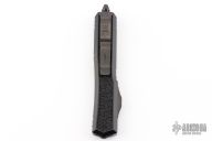 This Makora OTF automatic by Microtech features a black double edge blade. The handle has a black aluminum frame with nonslip inlays. Black stainless steel clip, tip down carry. Dated 06/2022 and 481 on clip. Comes with the original box. Excellent Condition.