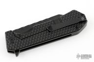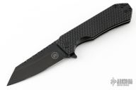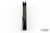 This Black Mamba V2 by Off-Grid Knives features a black clip point blade with fileworked spine and a flipper tab. The handle features a blackened titanium frame with dimple finish and tip up clip. Has a stainless lockface insert. Excellent condition. Comes with original box and papers.
