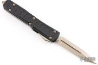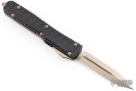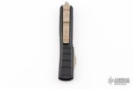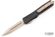 This Ultratech II by Microtech features a bronzed double edged blade. The handle has a black aluminum frame with a "stair step" design for better grip. Stainless steel tip down clip. Dated 01/2022 with s/n 493. Includes original box and papers. Excellent condition.
