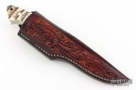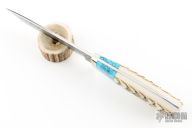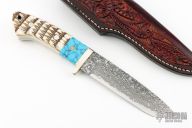 This Drop point Hunter features a drop point R2 Damascus blade, .142" blade stock and 1.231" blade depth, full tapered tang construction. The handle has a nickel silver guard, hand contoured turquoise and armadillo hide scales with thick white liners, mosaic and stainless pins and lanyard hole. Comes with hand tooled brown leather sheath with belt loop. Excellent condition.