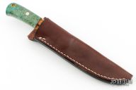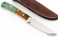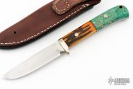 This utility hunter by Fumio Inagaki features a Cowry-X San Mai Damascus blade with .138" blade stock and .862" blade depth, full tang construction. The handle has a nickel silver guard, stag and green boxelder burl grip with nickel silver pins and a brass lanyard hole. Comes with a brown leather sheath. Excellent condition.