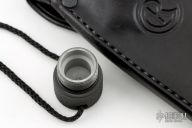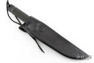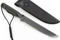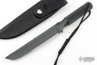 This rare 7" Tanto features a black coated, tanto shaped blade with notched thumbrest, .219" blade stock and 1.152" blade depth, integral construction. The knife features a knurled handle, screw off butt cap, and a black leather sheath. Comes with COA dated 9-16-94. Excellent condition. 30 year old knife. Comes with a zippered case.