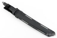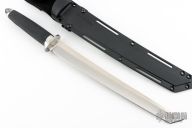 This Magnum Tanto XII by Cold Steel with San Mai VG1 blade in satin finish. Guard and pommel are stainless, .188" blade stock and 1.165" blade depth, hidden tang construction. Handle is textured Kraton for a sure non-slip grip. Lanyard hole and glass breaker. Comes with Secure-Ex sheath with a nylon belt loop and original box. Excellent condition.