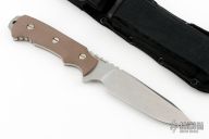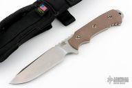This FieldTac 5.5 by Hinderer Knives features a stonewash finished blade with notched thumbrest, .227" blade stock and 1.360" blade depth, full tang construction. The handle has textured brown G-10 scales. Comes with a black SpecOps brand sheath. Excellent condition.