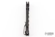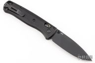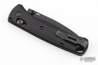 The Bugout features a drop point blade with a black finish. It's a manual opener with ambidextrous thumb studs. This AXIS lock has a milled aluminum frame and black hardware, a black mini deep-carry pocket clip, and a lanyard hole. Includes original box, drawstring pouch and papers. Excellent condition.