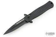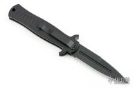 This collaboration between Darrel Ralph and Ryan Wilson of Wilson Tactical is the Stiletto Auto with black aluminum handle. Black coated blade with blood groove in the center and a ground but not sharpened top edge. Smooth firing auto with a strong lock up. Has a couple scuffs on the frame, otherwise excellent condition. Comes with original box.